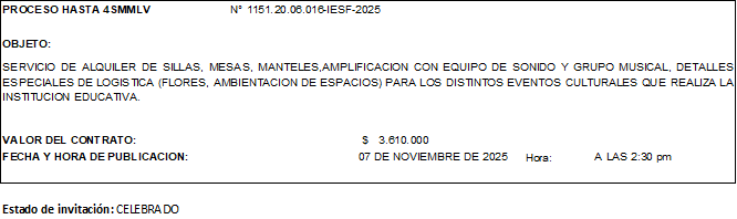 PROCESO No. 01-IESF-2026 CONCESION TIENDA ESCOLAR 01-IESF-2026 TIENDA ESCOLAR ESTUDIOS PREVIOSDescarga 01-IESF-2026 TIENDA ESCOLAR AVISO INVITACIONDescarga 3. CIERRE 01-IESF-2026 TIENDA ESCOLARDescarga 4. APERTURA 01-IESF-2026 TIENDA ESCOLARDescarga 5. EVALUACION 01-IESF-2026 TIENDA ESCOLARDescarga