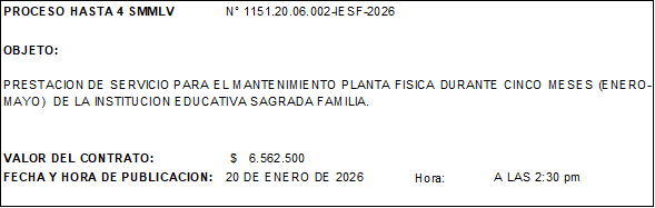 Contratación directa 2026 Por orientación de la Secretaria de Educación y conforme a la legislación vigente, me permito dar a conocer la GUÍA DE CONTRATACIÓN para las Instituciones Educativas del Municipio de Palmira.NUEVA GUIA DE CONTRATACION RESOLUCION 522 DEL 1 DE MARZO DEL 2022 PROCESO No.1151.20.06.003 SERVICIO CIUDAD EDUCATIVA 1. ESTUDIOS PREVIOS 06.003 CIUDAD EDUCATIVADescarga 2. ACTO ADMINISTRATIVO 06.003 CIUDAD EDUCATIVADescarga 3. CONTRATO PRESTACION DE SERVICIODescarga 4. ACTA INICIAL 06.003 CIUDAD EDUCATIVADescarga Proceso No. 1151.20.06.002 SERVICIO MANTENIMIENTO PLANTA FÍSICA 1. ESTUDIOS PREVIOS 06.002 MTO GENERAL PLANTA FISICADescarga 2. ACTO ADMINISTRATIVO 06.002 MTO GENERAL PLANTA FISICADescarga 3. ANEXO 1. ESPECIFICACIONES TECNICAS 06.002 MTO GENERAL PLANTA FISICADescarga 4. EVALUACION 06.002 MTO GENERAL PLANTA FISICADescarga 5. ADJUDICACION 06.002 MTO GENERAL PLANTA FISICADescarga 6. CONTRATO 06.002 INFRAESTRUCTURADescarga 7. ACTA INICIAL 06.002 MTO GENERAL PLANTA FISICADescarga Proceso No.1151.20.06.001 PRESTACION SERVICIO CONTADORA 1. ESTUDIOS PREVIOS 06.001-26 CONTADORA IESFDescarga 2. ACTO ADMINISTRATIVO 06.001-26 CONTADORA IESFDescarga 3. CONTRATO CONTADORA SANDRADescarga 4. ACTA INICIAL 06.001-26 CONTADORA IESFDescarga